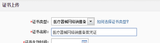 证书上传入口。 证书类型:经营许可类证书——医疗器械网络销售备案凭证,如下图